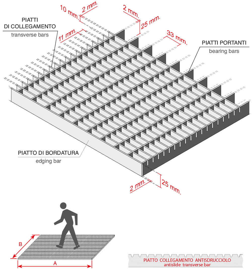 – Grigliato pressato Mec Master EK100 formato da maglia mm 33×11, piatto portante da 25×2 a 120×5 mm con piatto di collegamento di mm 10×2 a bordi arrotondati; struttura monolitica in ferro S235 JR ottenuta tramite processo di pressatura e saldatura a induzione.